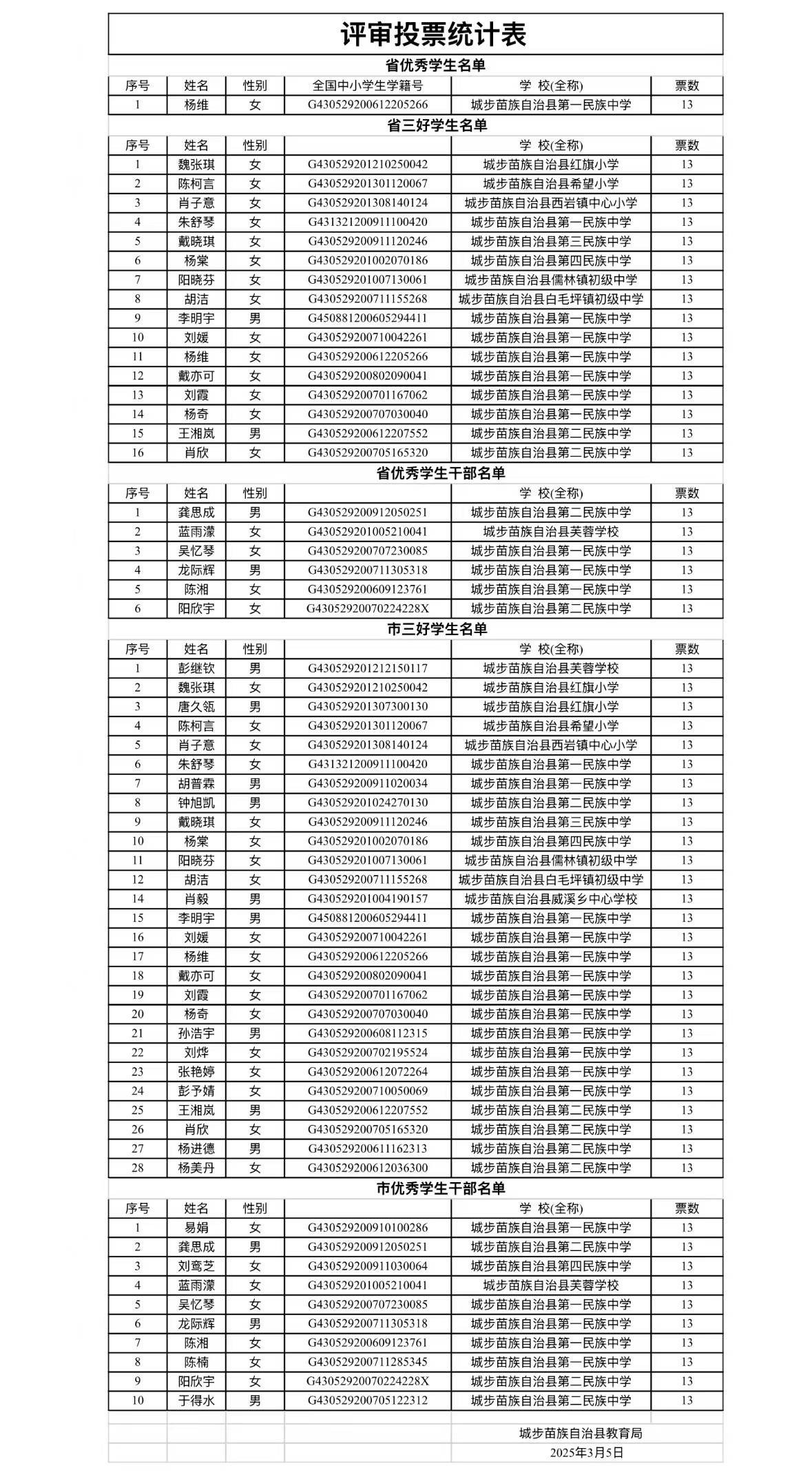 根据湖南省教育厅、邵阳市教育局工作部署,现将我县拟推荐2024-2025学年度省优秀学生、省市三好学生与优秀学生干部名单进行公示,下列同学如有重大违纪行为,请实名举报。举报电话0739-7368030
