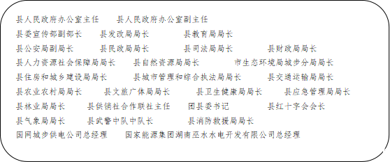 指挥部成员由县人民政府办公室主任、县委宣传部副部长、县人民政府办公室副主任、县发展和改革局局长、县财政局局长、县教育局局长、县公安局常务副局长、县司法局局长、县民政局局长、县人力资源和社会保障局局长、县自然资源局局长、市生态环境局城步分局局长、县住房和城乡建设局局长、县城市管理和综合执法局局长、县交通运输局局长、县农业农村局局长、县文旅广体局局长、县卫生健康局局长、县应急管理局局长、县林业局局长、县供销联社主任、团县委书记、县红十字会秘书长、县气象局局长、县武警中队中队长、县消防救援局局长、国网点点注册下载什么软件供电公司总经理、国家能源集团巫水公司总经理担任。
