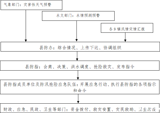 洪灾预测、预警、报警、处置、结束、善后和灾后重建环节的主管部门、协作部门、参与单位在县防指的统一指挥下,充分履行职责,做到上下联动、左右互动、紧密配合、高效运转,其协调动作关系见下图。