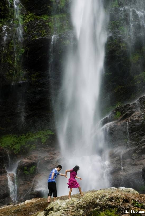 玉女溪景区最为壮观的当数玉女瀑布,它从60多米高的悬崖顶部腾空飞来,倾泄而下,洒珠溅玉,水雾如烟,气势磅礴,从上至下形成了一幅巨大的白色水帘,日久积深,底部形成一泓宽约30m2的清潭,潭面的水雾犹如千万条绽开的雪莲,在阳光的折射下常会出现绚丽的彩虹(如果大家在此耐心等等的话就一定会碰上这难得一见的奇观哦)。你们瞧,那浓情相伴的两棵树,能猜到有多大年纪了吗?别看它们还小,据这周围的老人讲,从来就是这么大,一年四季,常青如此,婀娜相依,宛如一对深情相守的金童玉女,给这一方净土平添了几多灵气和娇媚。大家听,水落潭底的声音不正是金童玉女大声宣讲爱的宣言吗。