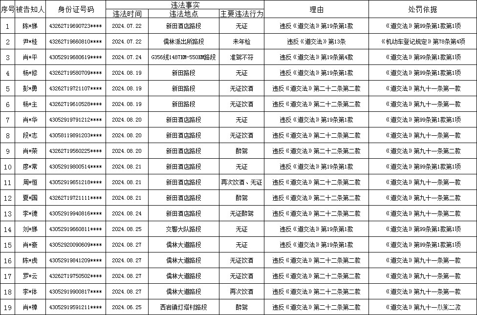 下列被告知人(见附表)在城步苗族自治县实施道路交通安全违法行为,被我大队依法查获并开具《公安交通管理行政强制措施凭证》或《道路交通安全违法行为处理通知书》。因被告知人无正当理由逾期未接受处理,我大队根据《湖南省实施<中华人民共和国道路交通安全法>办法》第四十六条第二款的规定,按照备案信息中的联系方式,通过邮寄《行政处罚告知书》等方式将拟作出的行政处罚决定的事实、理由、依据以及依法享有的权利予以告知,但被告知人未在告知后30日内接受处理,现采取公告方式告知拟作出行政处罚决定的事实、理由、依据、依法享有的权利,公告期为7日。公告期内,被告知人有提出陈述、申辩的权利,处吊销机动车驾驶证或单个违法行为较大数额(2000元以上)罚款的有要求听证的权利。需要陈述、申辩、听证的,应当自本公告发布之日起7日内向城步公安局交警大队依法提出,逾期未提出的,视为放弃陈述、申辩和听证权利,公安机关交通管理部门将根据调查的证据依法作出行政处罚决定。