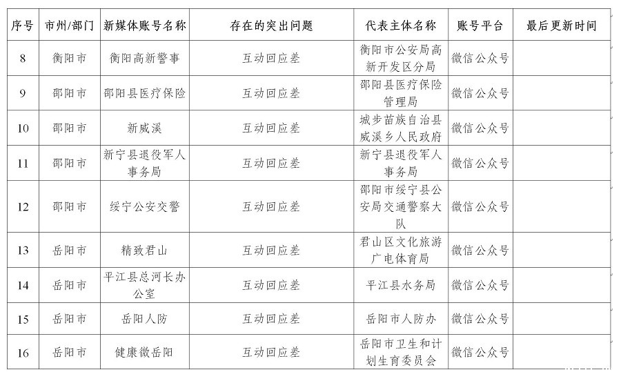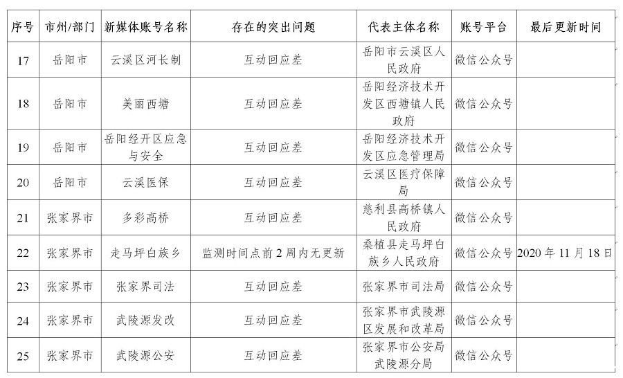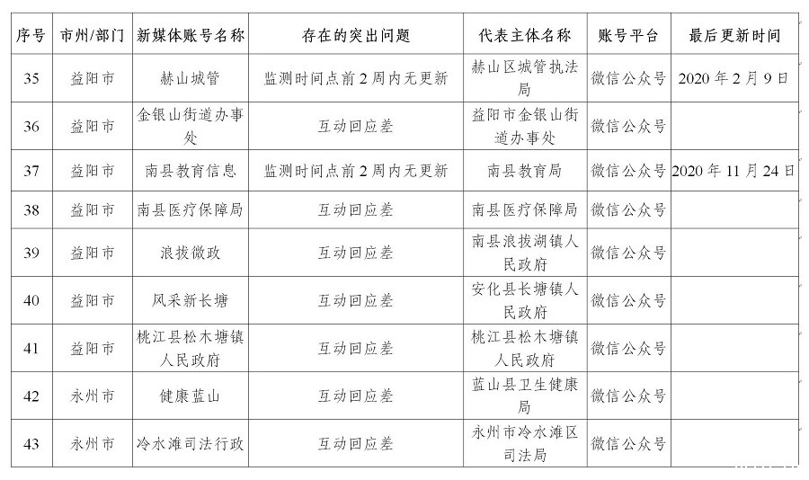 (三)政务新媒体运维管理仍需规范。本季度检查共有44家政务新媒体存在突出问题,其中37家为微信公众号未提供有效互动功能,占比84.09%,个别政务新媒体为满足更新检查要求,转发天气预报、央视新闻等与本部门职能职责无关内容。益阳市、张家界市和岳阳市所主管的政务新媒体中分别有11家、10家和8家存在突出问题,监管工作需进一步加强。