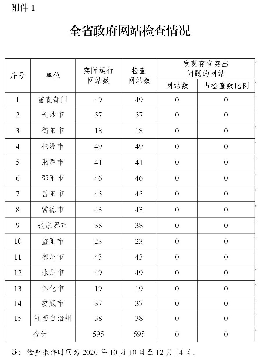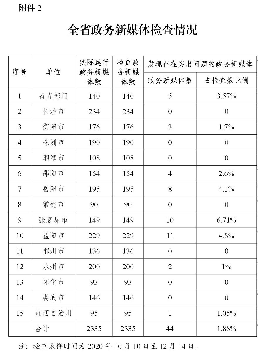 2020年第四季度,省政务局组织对全省正常运行的595家政府网站进行全覆盖检查,未发现存在突出问题政府网站,总体合格率100%;对全省正常运行的2335家政务新媒体进行普查,发现44家存在突出问题,总体合格率98.12%,其中长沙市、株洲市、湘潭市、常德市、郴州市、怀化市、娄底市政务新媒体检查合格率100%。